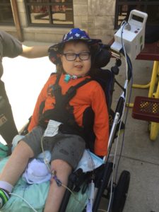 “It shows how much our kids can do,” says speech therapist Jenny Winberg, who has been working closely with Carter since the beginning. She takes him for walks by the lake, and he can now use an AAC to tell her when he wants to make his stroller “go!” The AAC is an augmentative and alternative communication device.