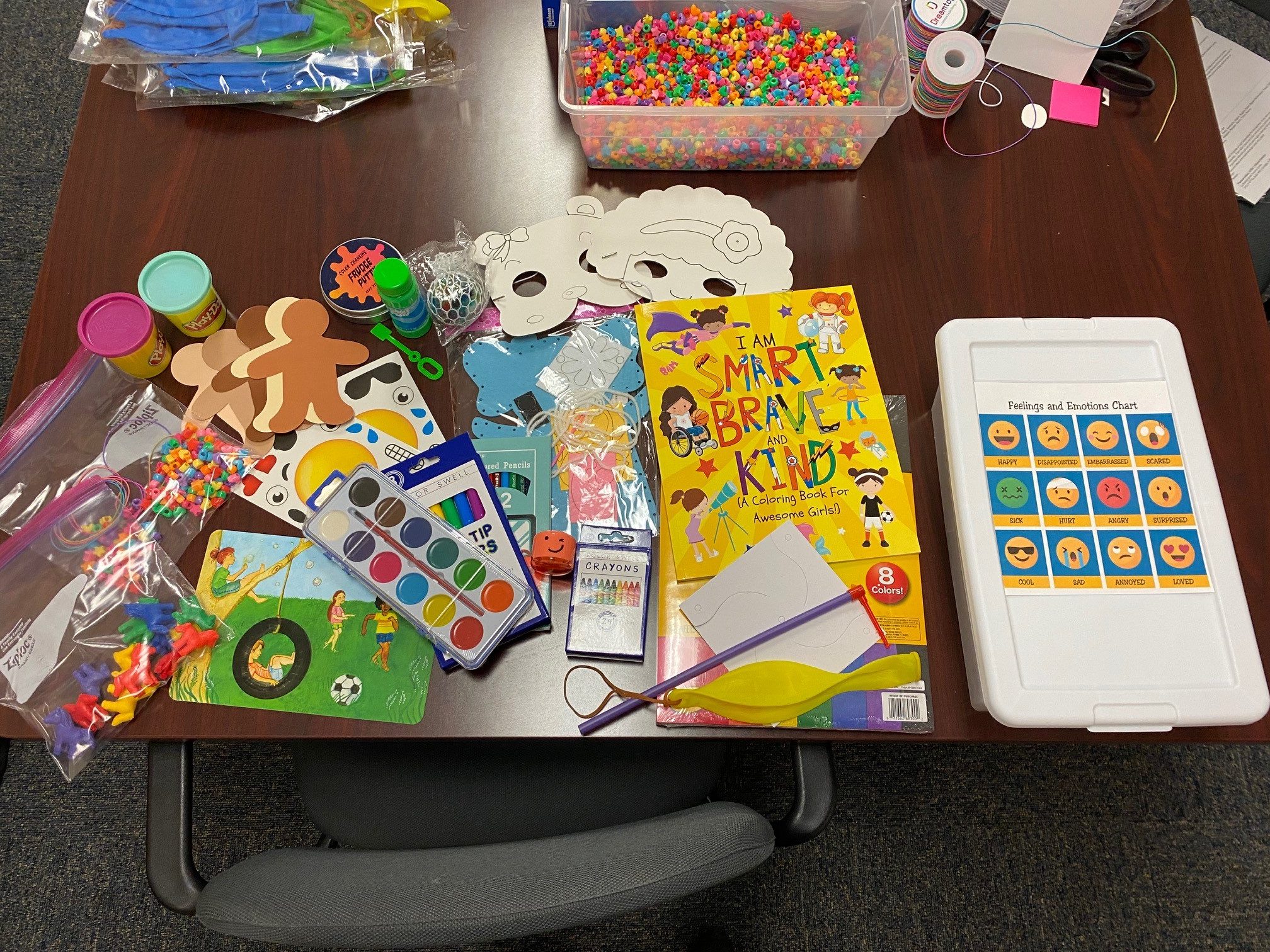 Also included in the therapy kits are calm-down tools including stress balls, stress putty, and fidget toys.