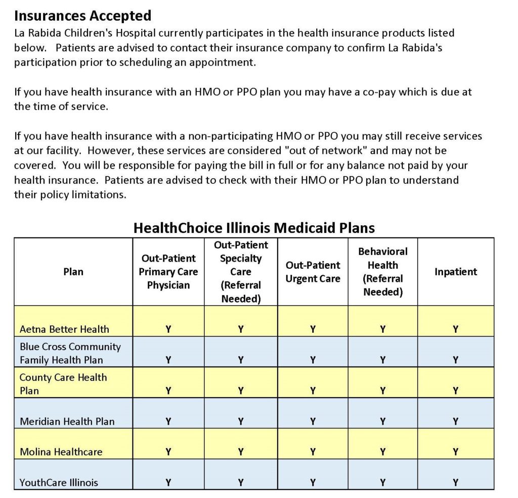 Plans are subject to change from time to time. We encourage patient families to verify La Rabida is a participating provider of their health benefits network and that services their child may require are benefits eligible.