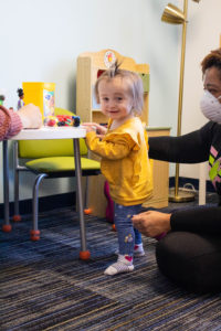 Through La Rabida’s Child and Family Connections (CFC), children and families can enter the Illinois Early Intervention program. Early Intervention (EI) is a statewide program that provides support and services for families to help children under the age of three to help them meet developmental milestones. “I picked La Rabida because it was local and they have a good reputation,” shared Christy. Maggie and her family were connected to Aylin Benitez, service coordinator at La Rabida’s CFC, and Laurie Webb, Maggie’s physical therapist.