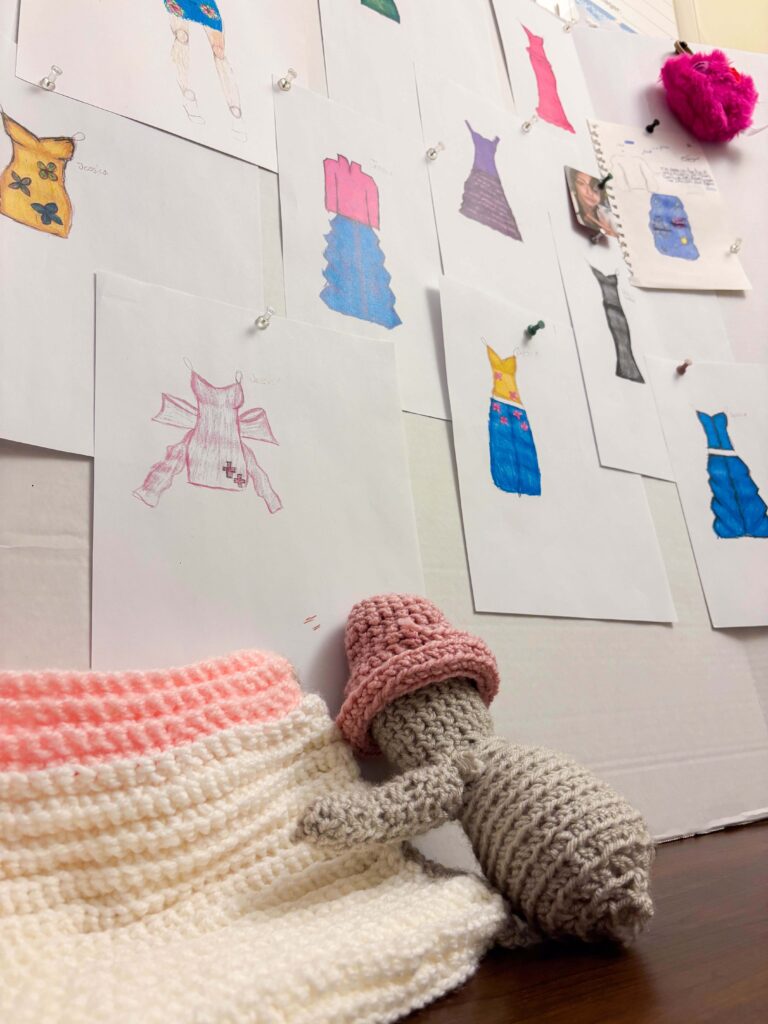 Designs of dresses, denim outfits, and imaginative drawings are scattered throughout Jessica’s cabin. Knitted hats and scarves created by hand are all uniquely designed by Jessica’s creative mind.