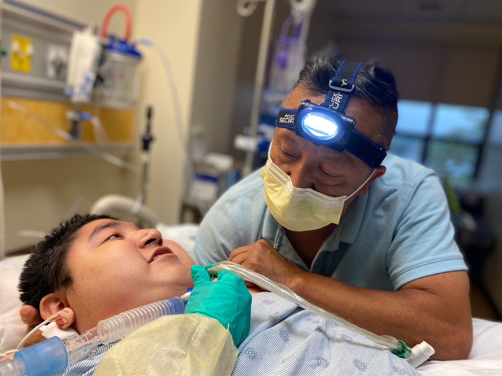 Recently, his son Israel required a ventilator to help him breathe, and he found himself at La Rabida. He can’t return home until his family can learn how to care for his trach tube. So his dad Felix bought a headlight, one you might use for camping or spelunking. It helps him see what he’s doing, as the care team walks him through the process.